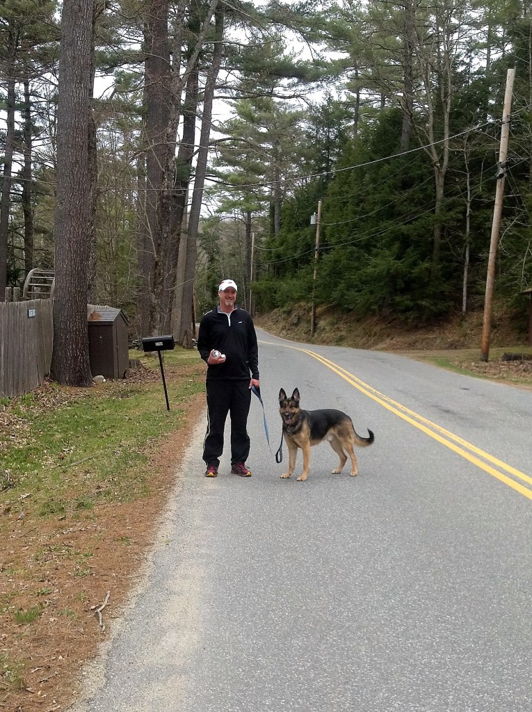 That’s my story, and I’m stickin’ to it. I have variously run with two Siberian Huskies and a Husky mix, a 145-pound Shiloh Shepherd (think SUV version of German Shepherd), an incredibly athletic and fleet-of-foot German Shepherd Dog, and now a Chesapeake Bay Retriever mix. The Huskies were hellish running partners who mainly wanted to pull; if you happened to stumble and fall, those ninnies just pulled harder. Still, I felt invincible with three Huskies out in front of me. The Shiloh and the GSD were delightful running partners who lived to protect and serve. Scout, my ‘Goldapeake Retriever,’ is a curmudgeon who mainly humors me. His vet back in Vermont explained to me he is a ‘heavily muscled’ dog who has a tough time getting rid of heat, which is to say, he overheats quickly if the conditions are ripe for it; I’ve learned his tolerances. He was an excellent runner when we lived in Vermont, but North Carolina is proving more difficult for this nine-year-old canine. We take it one day at a time.