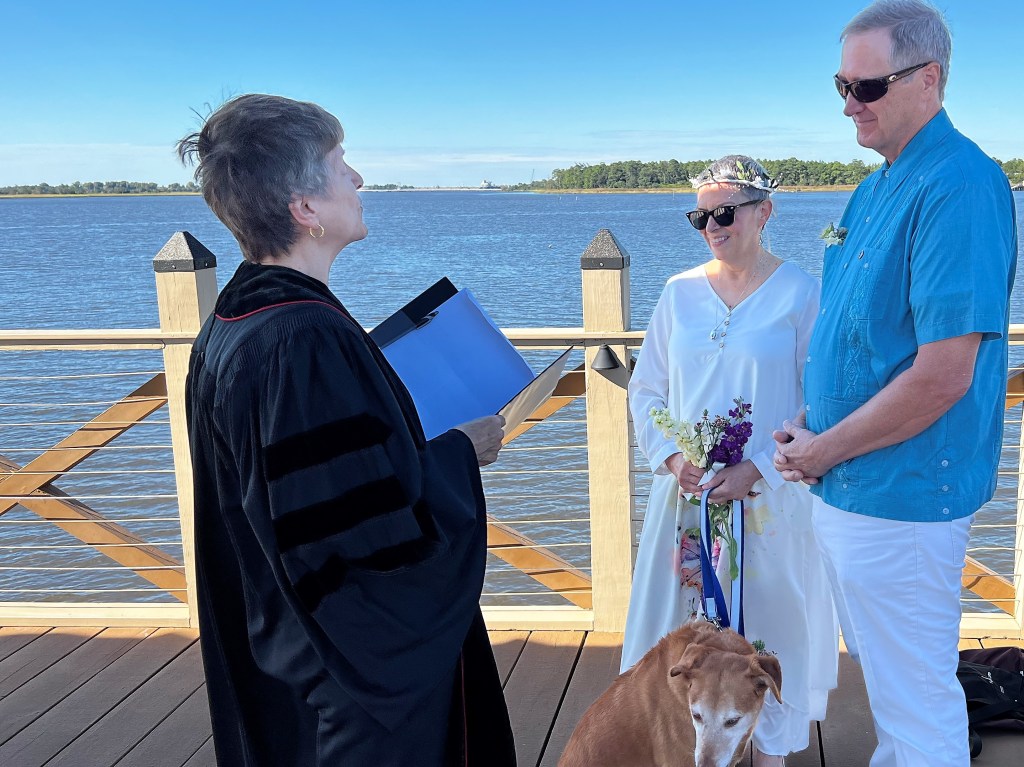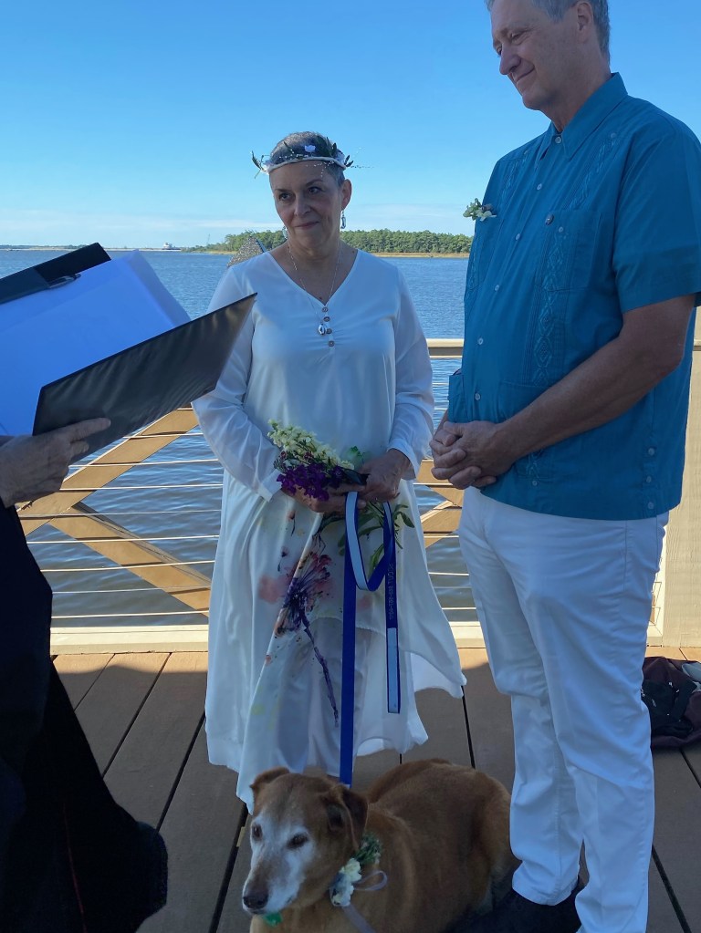 So on a flawless, sunny North Carolina day we stood out on a pier overlooking the Cape Fear River and said simple, beautiful wedding vows. I wore an inexpensive mail-order dress with colorful dandelion and dragonfly artwork splashed on the front, and made a flowery headpiece to go with it using materials I had on hand. I also wore a sterling locket I’ve owned since my kiddo was a peanut; inside it is a minuscule paper scroll with his name scrawled upon it in his unsteady four-year-old hand. David wore a beloved linen shirt he’s owned for decades with his khaki trousers. I picked up some flowers at the grocery store and made an arrangement to carry, and also made a small boutonniere for David, and attached another to Scout’s collar. Notably, a local artist made our rings, which we cherish.