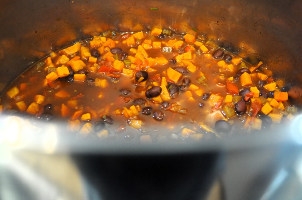 Add the sweet potatoes, stir together well, and cook for a further 3 minutes. Add the tomatoes and stock, bring to a boil, then reduce the heat and simmer, covered, for 25 minutes or until the sweet potatoes are tender.