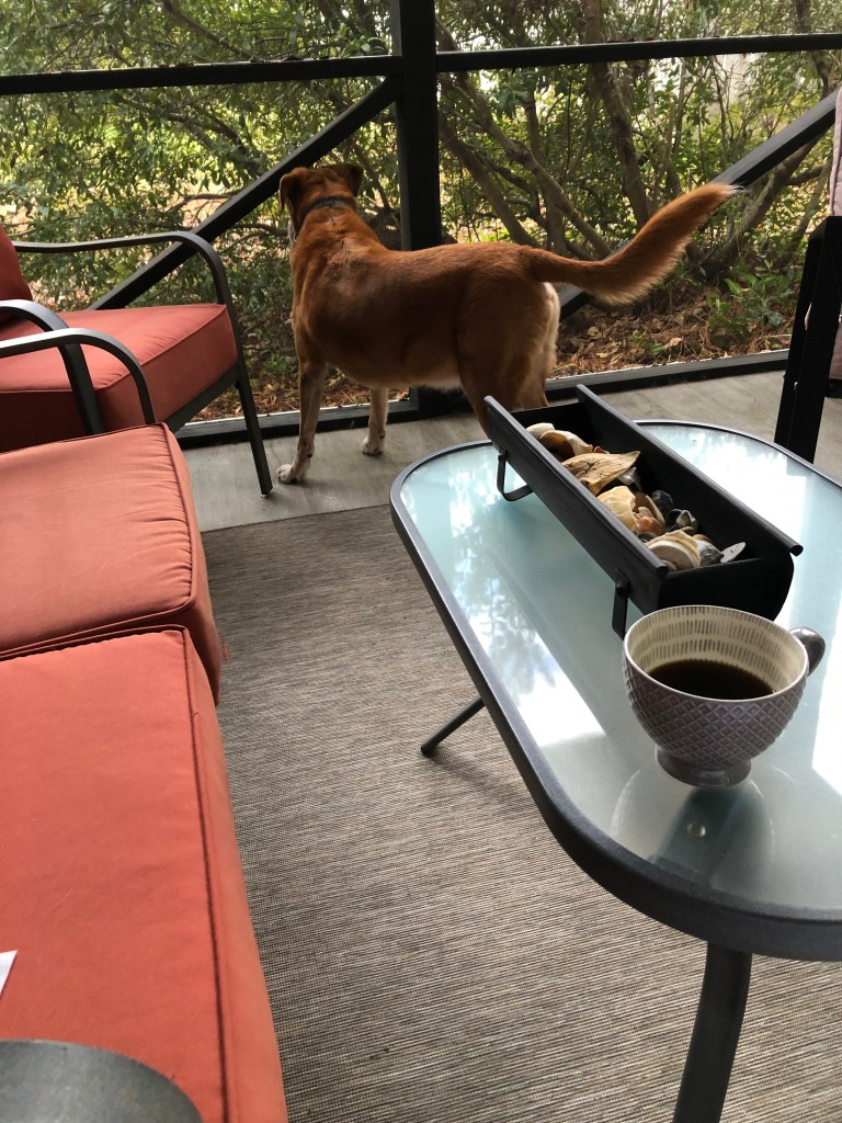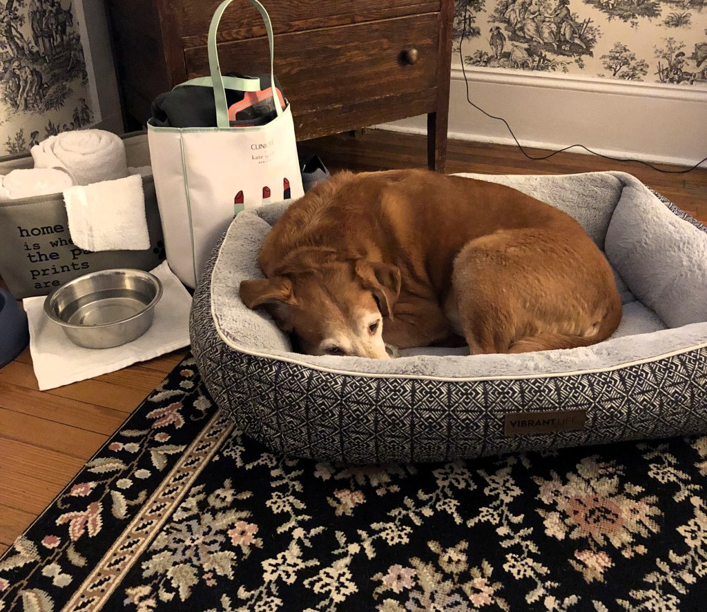 Scout-the-Goldapeake Retriever relaxing at our B&B in Asheville on Thanksgiving