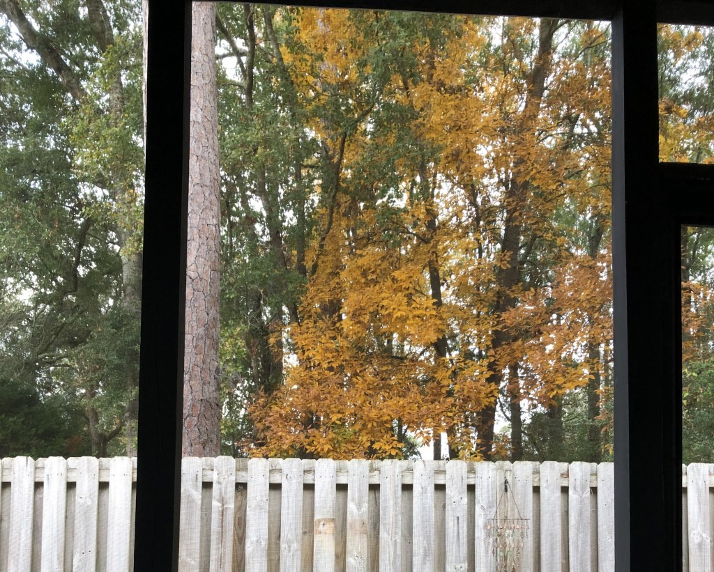 We’re settled once more into the daily grind, but feeling a tad rushed in preparations for Christmas, almost here. This morning the air was mild and the sky a little gloomy ahead of the long front marching across the eastern US, the same that wrought tornadoes upon Nashville yesterday. So Scoutie and I sat outside, a rare occasion in December, I reading my book and he on high alert for the squirrels, at times vexingly on just the other side of the screen, his screen. We don’t have foliage down this way like we had it in New England, but I love that this one tree in the wood behind our patio is showing off so boldly, perhaps a hickory, among the loblolly pines and live oaks around it.