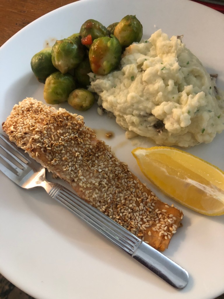 Quick food story: Last night’s Brussels sprouts were an experiment. The produce aisle where we shop always has fresh sprouts, but their condition from week to week is wholly unpredictable. In fact, the only thing predictable about them is their inflated price. But last Saturday we discovered organic frozen sprouts, and decided there was nothing to lose. Chef David prepared a supper last night of sesame salmon, garlic mashed ‘taters, and sprouts dressed up with hot salsa. Success!