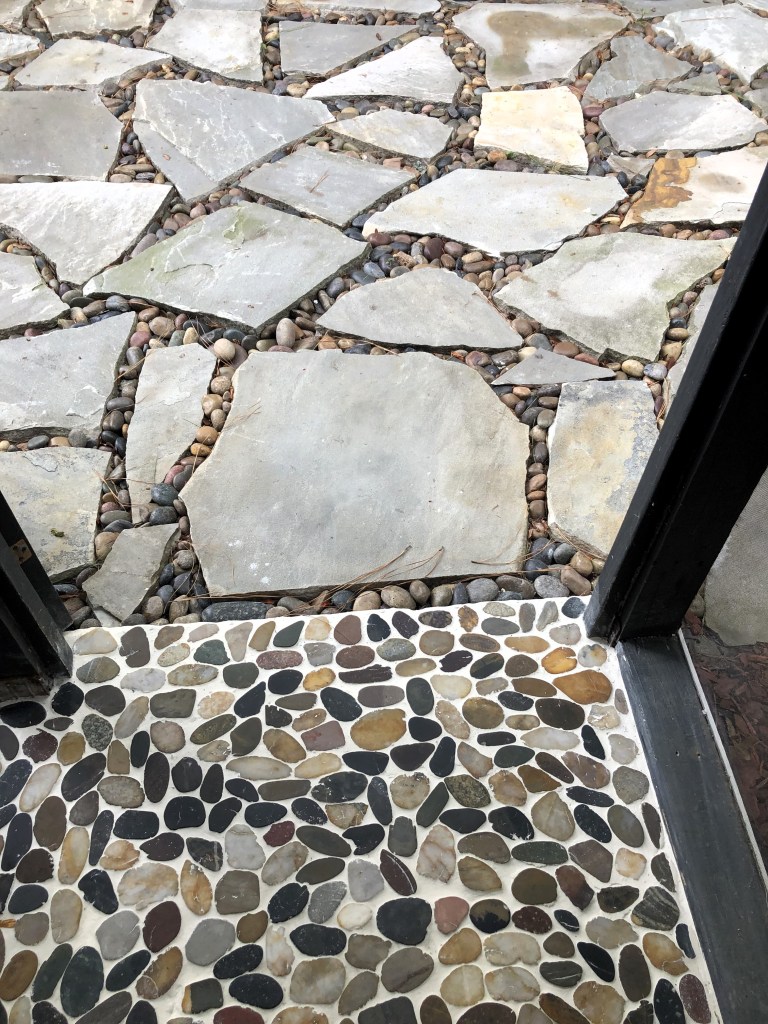 I have been spending long hours writing, but working on a more ambitious project outside of the blog. It is high time to check in, not quite high summer but sure feels that way. Against all odds, when the atmosphere outside is this oppressive (but not this oppressive), somehow our screen porch has remained a tolerable place to linger over coffee in the morning, iced tea midday, and a cool martini in the evening, serenaded by occasionally deafening Carolina Wren visitors (so small to be so loud!) and a chorus of cicadas in the nearby wood. Imagine if you will a bed-sized swing suspended from ropes in front of those drapes (there is more, much more to do in the courtyard beyond, starting with replacing the rotted fence). All of that comes after our wallets recover a bit from what we’ve done thus far: purchased and installed (thank you, Chef David) gorgeous river rock mosaic tile; purchased and assembled (thank you, Chef) new Adirondack chairs, ottomans, and one table; purchased and installed exterior hardware and hung weather-proof drapes; and purchased (all the way from Ukraine!) handmade nautical rope tie-backs (thank you, thank you, and thank you). I am lucky my partner in life has skills and is willing to humor my penchant for doing things just so. I realize I can be a pain in the behind.