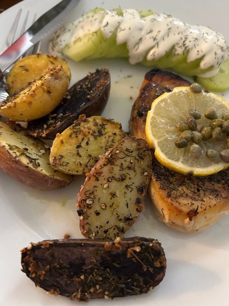 Yesterday Chef David stopped on his way home from errands and picked up a nice piece of tuna and then made seared fingerling potatoes and an uncomplicated cucumber salad to go with. We flipped on the 2020 adaptation of Jane Austen’s Emma, and sipped some cheap (but quite good) Prosecco and nibbled on a perfectly sufficient store-bought Panettone, about which much chatter and opining. Funny I should open the pages of my latest New Yorker this morning to find a quick rundown of the best three Panettones in the city, said the writer. (Can you find them online? Sure can, but expect to pay upwards of $100 apiece. Maybe next year.)